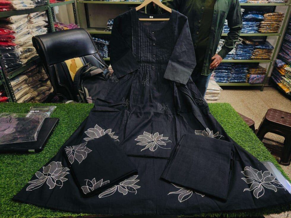 Black Long Kurta having Discharge Floral Print and Printex, Pants & Dupatta Size-L