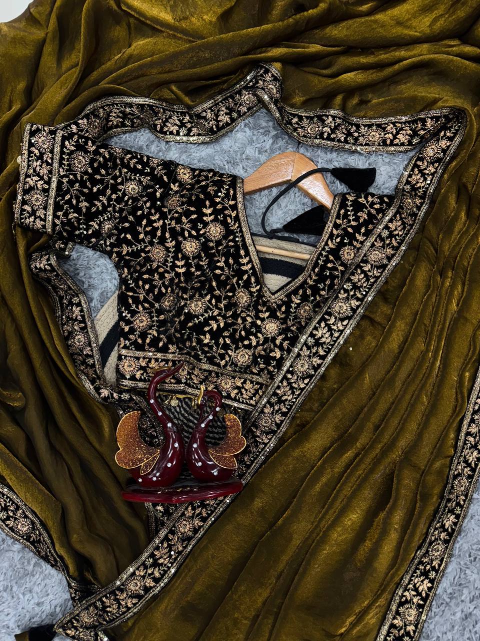 Pure silk saree with sequins, zari embroidery, lace border, fancy latkan, velvet blouseβperfect for sangeet or cocktail.